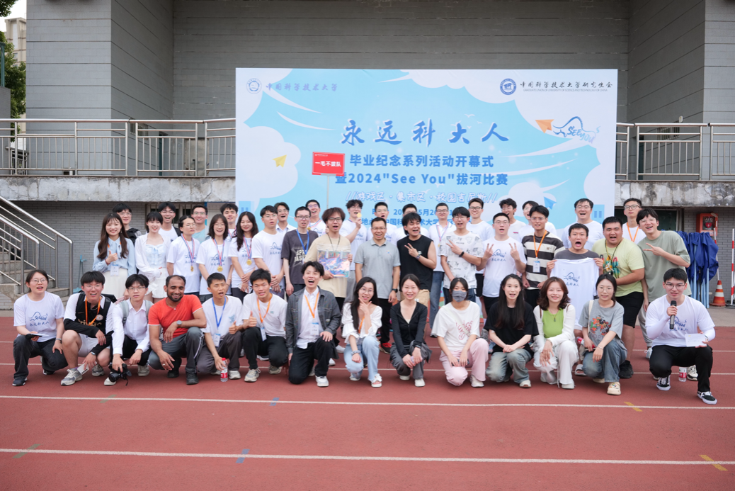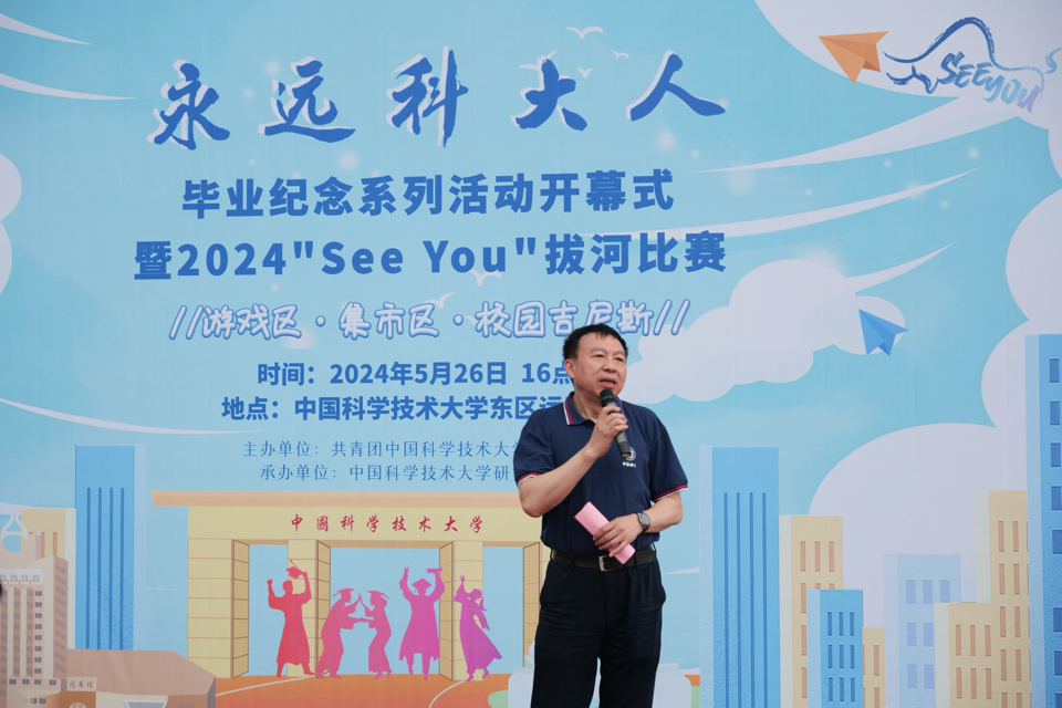 5月26日,中国科学技术大学“永远科大人”毕业纪念系列活动开幕式暨2024“See You”拔河比赛在东区运动场举行。校党委书记舒歌群出席活动并致辞,校团委书记千坤老师,校团委副书记林高华老师及各院系参赛师生参加活动。本次活动由校团委主办,校研究生会承办。