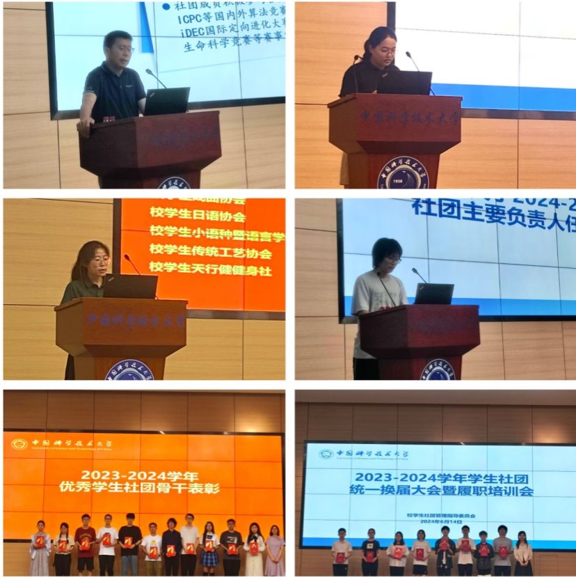 为切实加强学生社团建设管理,支持学生社团健康有序发展,6月14日晚,我校2023-2024学年学生社团统一换届暨履职培训会在东区理化大楼东三报告厅召开。校党委副书记、社团管指委主任邓建松,学生工作部(处)副部(处)长、社团管指委副主任金顺玉,研究生院培养办公室主任、社团管指委副主任王莉,国际合作与交流部副部长、社团管指委副主任沈义竹,校团委兼职副书记、社团管指委副主任李海欧等相关单位负责人,管指委学生委员、新老社团负责人共同参加换届培训会议。会议由校团委书记千坤主持。