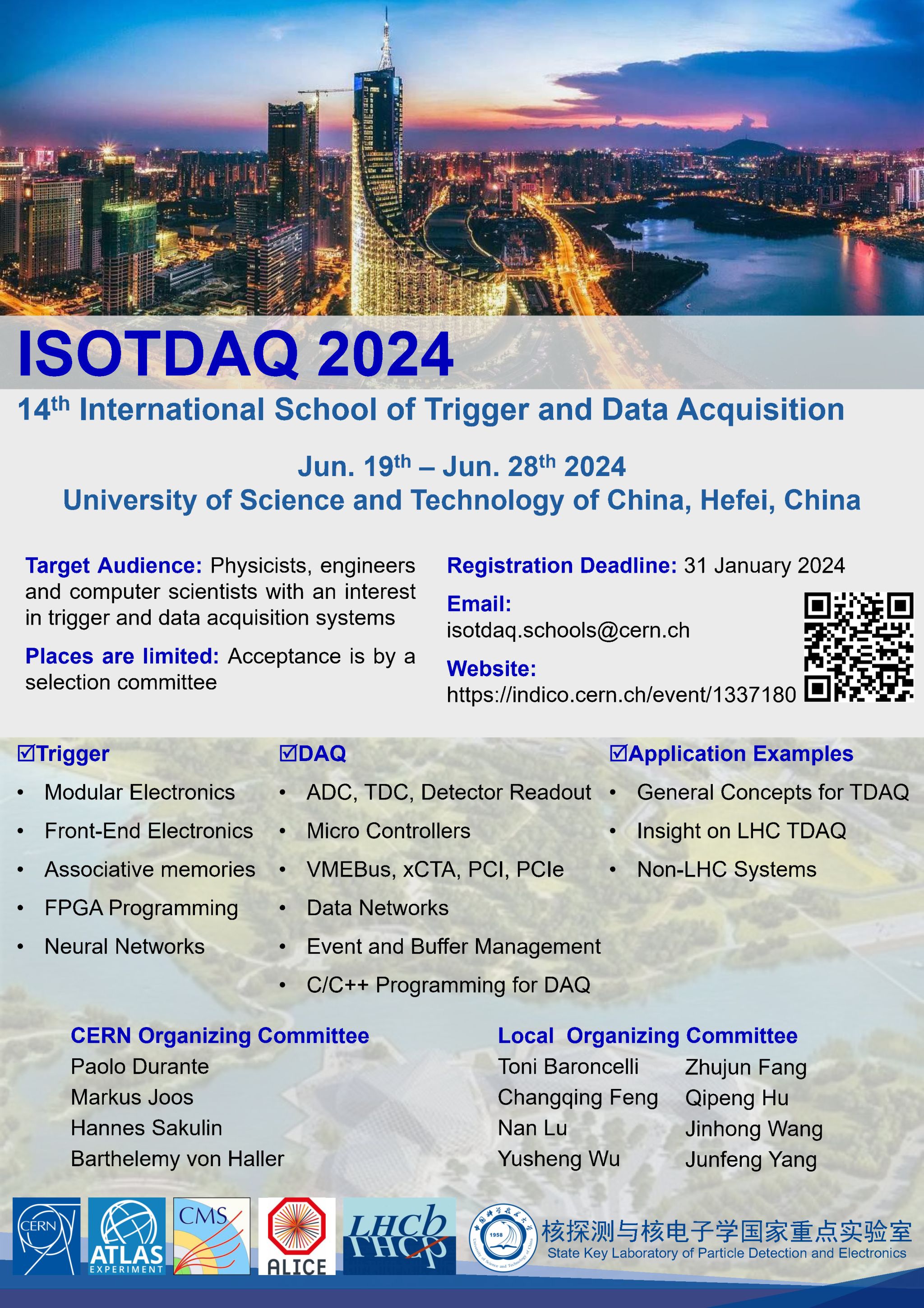 6月19日至28日,第14届触发与数据获取国际学校(以下简称国际学校)在我校成功举办。本届国际学校由欧洲核子中心主办,我校物理学院、粒子科学与技术研究中心、核探测与核电子学国家重点实验室承办,国际合作与交流部、教务处、物理实验教学中心、安徽省人民政府外事办公室协办。国际学校旨在向全球物理、工程和计算科学领域的学员传授科学研究中事件触发与数据获取的先进技术与方法,由21位国际知名研究机构和大学的一线研究人员授课,55名来自美国、德国、意大利、加拿大等国内外的高校学生参加学习。