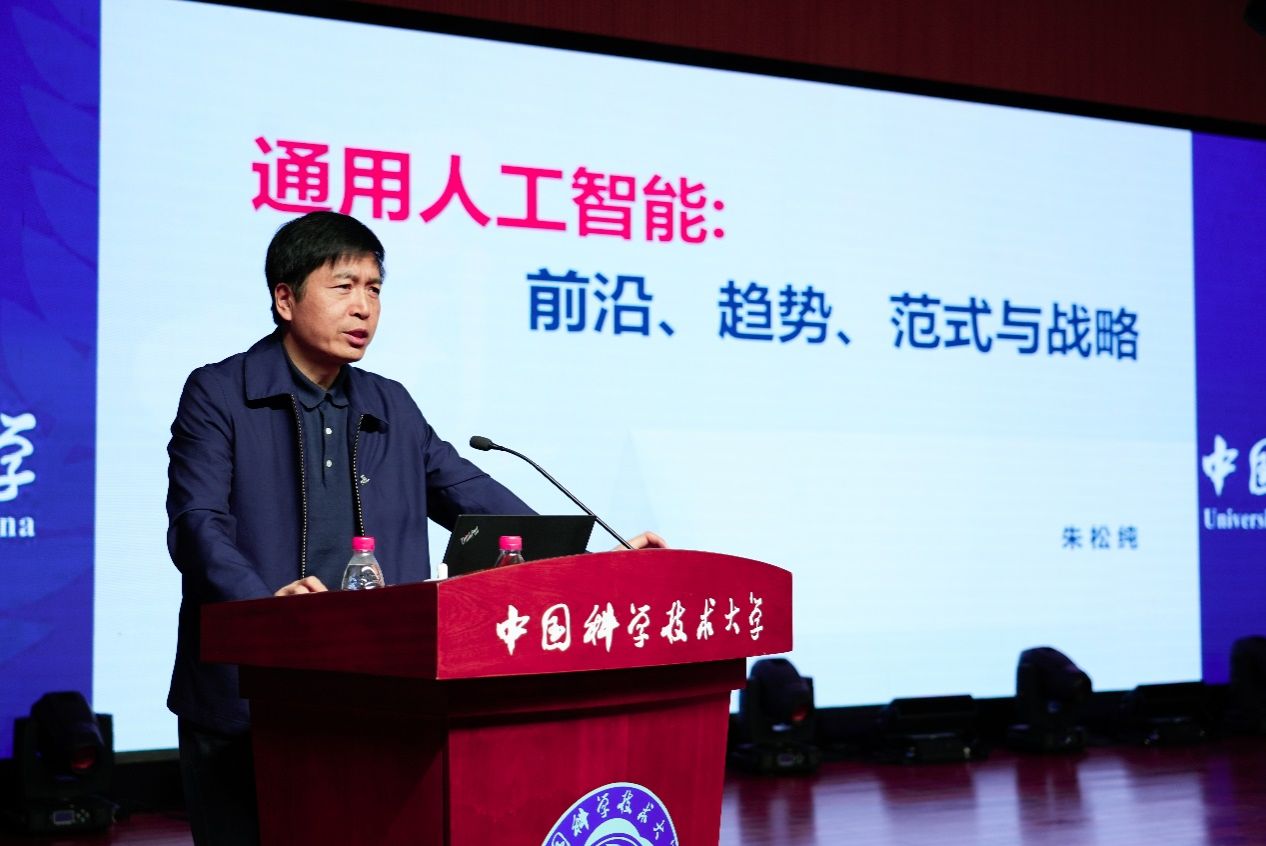 6月20日上午,2023级本科生“科学与社会”研讨课第六场主题报告会在西区活动中心举行。全球著名计算机视觉、人工智能领域专家朱松纯教授应邀以《通用人工智能:前沿、趋势、范式与战略》为题,为全校师生作“科学与社会”研讨课主题报告。报告会由教务处副处长吴雨生教授主持,信息与智能学部党工委书记李斌教授、人工智能与数据科学学院执行院长张燕咏教授出席报告会并向朱松纯教授赠送主题报告纪念牌。