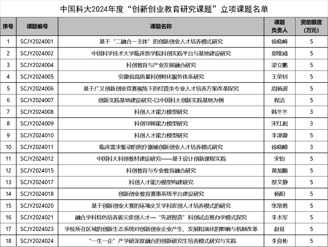 近日,中国科大2024年度“创新创业教育研究课题”经过课题申报、资格审查、专家评审、立项公示等环节,共有“基于‘二融合一主体’的创新创业人才培养模式研究”等18个课题被选定为我校2024年度“创新创业教育研究课题”(详见学校主页通知链接:https://www.ustc.edu.cn/info/1364/21632.htm)。
