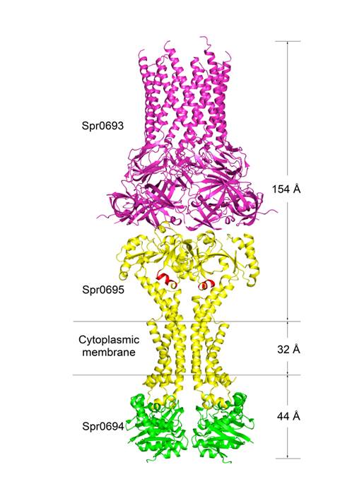 周丛照教授、陈宇星教授课题组利用X-射线晶体学手段解析了肺炎链球菌中ABC转运蛋白Spr0694-0695和Spr0693的三维结构,是第一个革兰氏阳性菌中MacAB-like的药物外排泵。Spr0694-0695位于细胞膜上,不同于经典的ABC转运蛋白,它具有8次跨膜螺旋以及一个较大的胞外结构域;而Spr0693六聚体形成纳米管状结构,连接Spr0695与细胞壁。整合结构生物学、生物化学和微生物遗传学实验方法,鉴定了一条从Spr0695到Spr0693的底物转运通道,而且发现Spr0695的跨膜区与胞外区之间的一个alpha螺旋控制了该通道的开关,转运过程所需能量由Spr0694水解ATP提供。该工作不仅发现了一类全新的革兰氏阳性菌ABC转运蛋白的组织形式,而且阐明了药物外排的分子机理,为抗生素的设计和改造提供了结构基础。