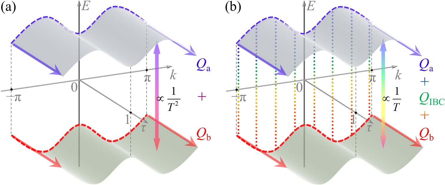 图:两能带模型上的索利斯泵。这里的E、k和τ分别是能量、准动量和归一化的时间。(a)在传统的索利斯泵中,初态没有带间相干,输运的粒子数Qa+Qb由每个能带的布居数分别贡献。(b)在广义索利斯泵中,初态有带间相干,输运的粒子数除了由每个能带的布居数分别贡献之外,还有来自初态带间相干的贡献QIBC。