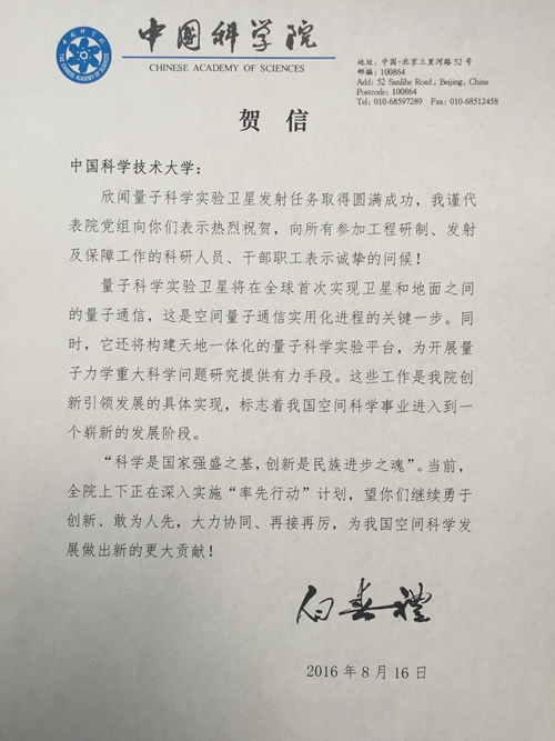 中国科学院院长、党组书记白春礼代表院党组,在第一时间向学校发来贺信,祝贺量子卫星发射任务取得圆满成功,向所有参加工程研制、发射及保障工作的科研人员、干部职工表示诚挚的问候。他希望学校继续勇于创新、敢为人先,大力协同、再接再厉,为我国空间科学发展做出新的更大的贡献。