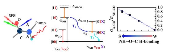 电子和能量转移过程被誉为化学反应动力学的心脏,直接决定化学反应的所有初始步骤。蛋白质分子能量转移对生化反应及生理功能的正常运作至关重要,许多重要的生理和细胞过程都依赖于蛋白质的超快能量转移过程,例如,构象变化传输和变构通迅与沿蛋白质骨架上的能量传输直接相关。快速且有效的能量转移是蛋白质维持在很窄温度范围内正常工作的重要保证。因而,理解生物膜界面蛋白质的能量转移过程是揭示膜蛋白质工作机制的关键。但是,迄今为止人们对蛋白质(特别是界面蛋白质)能量转移了解十分有限,例如,对振动能量如何在蛋白质内传输,如何与构象变化传输关联,如何导致功能,以及振动能量传递是否是直接的相干传递过程依然是未解之谜。其根源在于能量传递过程往往牵涉皮秒或更短时间尺度内的激发态动力学,而目前在理论和实验上对激发态动力学,尤其是界面激发态动力学的精确描述还缺乏行之有效的方法和数据积累。最近该小组独立搭建了振动态选择激发-和频光谱探测的飞秒时间分辨测量系统,其技术指标达到当前国际最先进水平。利用具有特定能量的飞秒红外脉冲选择激发生物膜上蛋白质的N-H基团,然后用飞秒和频光谱监控N-H基团的瞬态结构变化,首次成功测出水环境下生物膜上蛋白质N-H的振动能量转移速率(图1)。通过激发N-H基团,探测酰胺键C=O瞬态结构变化,研究者发现N-H到C=O的振动能量传递存在两种途径:一种是直接的NH-CO耦合作用
