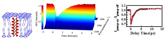 图1、选择激发生物膜上蛋白质螺旋结构N-H基团后,界面N-H基团的瞬态和频光谱。