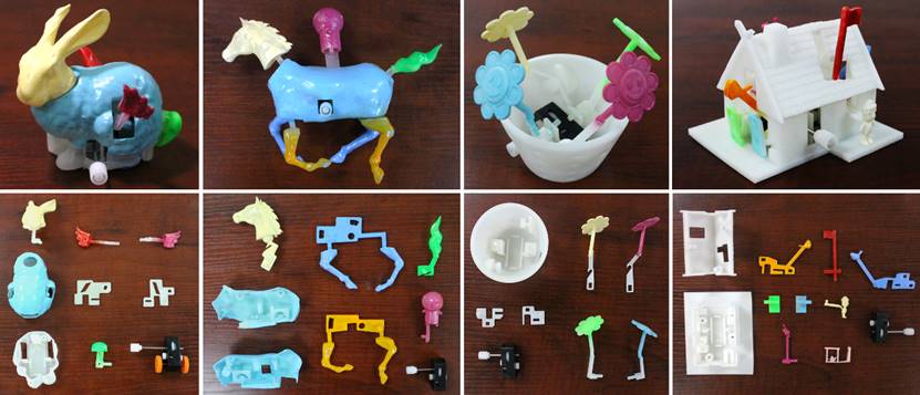 第二篇和第三篇论文的第一作者均为原计算机学院特任副研究员宋鹏老师(现已到瑞士洛桑联邦理工学院工作)。在第二篇论文中,首次提出一种计算方法,根据用户指定的玩具外形和运动,自动设计发条玩具的传动机构,可以直接用于3D打印快速制造出来。算法是对一系列基本的传动机构单元进行几何和运动学建模,通过连接这些基本机构单元自动构造出可以传递复杂运动的机构,最后对整个机构进行优化使得输出的运动达到指定效果。该研究结果在玩具设计界和3D打印业界受到高度关注,并有多家企业表示合作产品化意向。该文的通讯作者为数学学院刘利刚老师,其他主要参与者王晓飞现为数学学院一年级硕士生,唐逍现为计算机学院大四本科生,徐洪飞现为计算机学院二年级硕士生。合作单位有香港中文大学和伦敦大学学院。该工作得到了国家自然科学基金数学天元基金、国家自然科学基金和中科院“中科院人才计划”的支持。