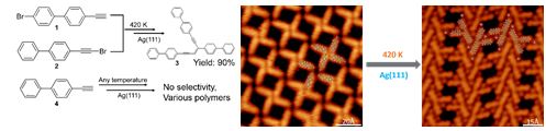 图.顺式烯二炔型化合物的表面选择性合成概略图及STM结果