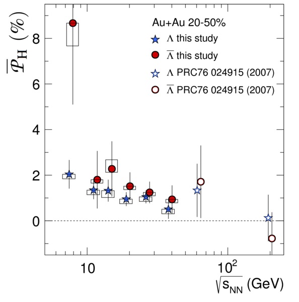 图2. STAR国际合作组关于Lambda极化的测量数据。纵轴是极化度,横轴是重离子碰撞的碰撞能量。