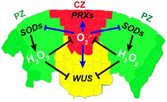 先前研究有报道过氧化氢在动物干细胞分化的调控有着重要作用。此研究表明,超氧根和过氧化氢作为新的信号调控植物干细胞的维持与分化。在植物茎顶端分生组织(SAM)中,超氧根主要在干细胞CZ富集,而过氧化氢主要在分化细胞PZ富集,这种分布模式依赖于一系列活性氧代谢基因在SAM中特异表达模式,研究发现绝大多数的超氧化物歧化酶特异在分化细胞PZ表达而过氧化物酶在干细胞CZ特异表达。CZ区超氧根通过正调控植物干细胞重要调控基因WUS的表达从而维持干细胞的稳定;而PZ区过氧化氢可以促进细胞分裂调控分化过程。此外该研究还发现超氧根和过氧化氢之间形成balance、相互拮抗,并通过调控WUS而决定干细胞的命运。该研究揭示这种新的干细胞调控的信号可能在植物和动物中是保守的,并为研究ROS-介导的干细胞命运的调控机制提供了理论基础。