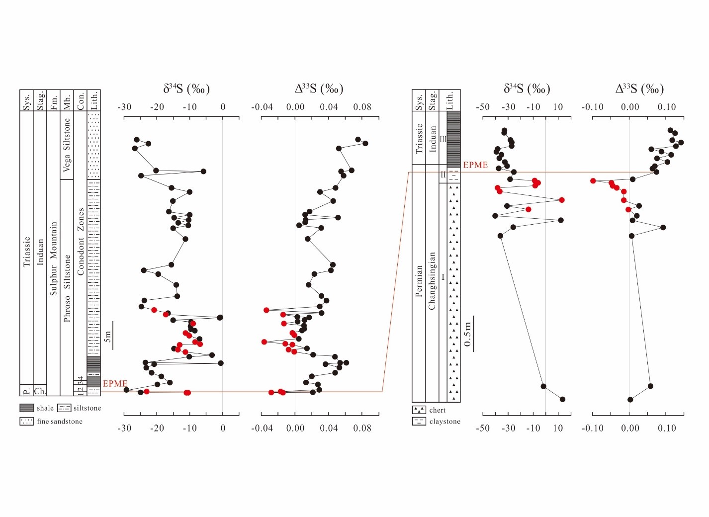 沈延安教授课题组对位于泛古洋东部的Opal Creek剖面 (现位于加拿大西部) 和西部的Gujo-Hachiman剖面 (现位于日本)进行了高精度的多硫同位素研究,发现二叠纪末期生命灭绝之前、生命灭绝期间以及生命灭绝之后都记录了异常的硫同位素组成(见下图)。因此,研究者提出硫化海水的间歇性上涌是造成大规模生命灭绝和随后生命迟缓复苏的主导因素。这一研究成果表明,古海洋环境的剧烈变化对早期生命演化具有重要影响。该成果能够对研究现代人类活动与全球气候环境变化的相互作用提供重要启示。