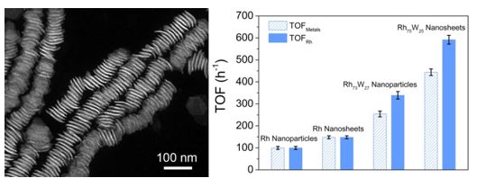 基于此,研究人员设计并构筑出二维RhW纳米片,其在CO2催化加氢反应中表现了卓越的催化活性。相较于Rh纳米颗粒、Rh纳米片、RhW纳米颗粒,二维RhW纳米片催化CO2加氢生成甲醇的转化频率分别是它们的5.9、4.0和1.7倍。在二维RhW纳米片中,量子限域效应的存在提高了催化剂表面电子的d带中心,从而增强催化剂对CO2的吸附。双金属协同效应使得W上的电子向Rh转移,从而作为催化活性中心的Rh上电子富集,在CO2催化加氢过程中,有利于CO2活化成 CO2δ-自由基,还可以增强中间产物的吸附,从而促进中间产物进一步加氢成甲醇。该项研究为通过调控纳米金属纳米晶表面电子状态提升催化性能提供了新的研究思路。