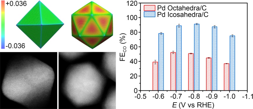 一般来说,催化剂的表面应力状态能够调制催化剂的电子结构,将对催化性能产生重要影响。但是,由于难以将催化剂的应力调控和电子结构调控孤立开来,针对表面应力结构在CO2电催化还原过程中的调控机制目前并不清楚。面对这一挑战,研究人员以Pd单晶八面体纳米晶和孪晶二十面体纳米晶作为准模型体系,在保证两者尺寸、表面晶面和表面包裹分子相同的情况下,研究了钯纳米晶表面应力与二氧化碳电催化还原性能之间的内在关联。在-0.8 V(vs. RHE)时,Pd孪晶二十面体纳米晶上生成一氧化碳的法拉第效率达到91.1%,远高于Pd单晶八面体纳米晶(~50%)。通过分子动力学模拟、第一性原理计算以及电化学测试,发现表面拉伸应力提升了Pd孪晶二十面体纳米晶的d带中心,从而增强了催化剂表面CO2的吸附和活化,显著提高了CO2电催化还原活性和选择性。该项结果诠释了催化剂表面结构与催化反应活性间的对应关系,对于设计高效CO2电还原催化剂提供了新的研究思路。