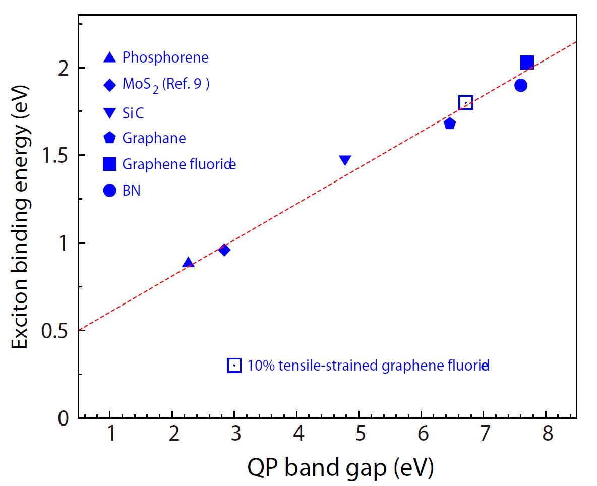 在以往的研究里,每发现一种新的有重要影响的低维材料体系,人们总习惯地采用最先进的计算和实验方法确定其激子结合能。在新的研究里,Jinho Choi和崔萍博士等人利用GW-Bethe-Salpeter-Equation (GW-BSE)方法首先计算了实验上新近发现的两种层状二维材料的激子结合能:黑磷(由我校陈仙辉教授研究组近年首次生长出高质量黑磷单晶)和氟化石墨烯。它们的激子结合能分别是0.85 eV和2.03 eV,再次验证了二维材料由于库仑屏蔽作用的减弱而具有很强的激子效应。更重要的是,他们将这些结果与其它几个有代表性的层状材料体系的激子效应作为整体考虑,发现二维半导体材料的激子结合能与准粒子能隙之间存在显著的线性标度关系,如图所示。利用类氢模型,结合k.p微扰理论,他们进一步解释了这种线性关系存在的内在物理原因,并用具体例子展示了这一标度关系对确定其它二维体系激子效应的普适性预测功能。