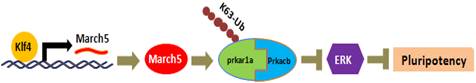 胚胎干细胞因具有分化为体内所有细胞类型的潜能,因此被认为具有极大的临床应用价值。然而,人们对于干细胞多能性维持的分子机制仍然并不清楚。吴缅教授领导的研究组在该项研究中发现一个线粒体定位的蛋白March5能够作为Klf4的下游转录靶蛋白,催化蛋白激酶PKA的负调节亚基Prkar1a,使之发生K63位多聚泛素化,进而激活PKA,最终抑制Raf/MEK/ERK信号通路,以此来维持胚胎干细胞的干性;这一研究结果揭示了Klf4-March5-ERK信号通路调控干细胞干性的全新机制。