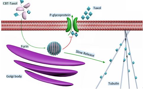 肿瘤的多药耐药(MDR)性是导致癌症化疗失败的重要原因之一,也是临床癌症治疗的最大挑战。MDR现象源于具有能量依赖性“药泵”功能的细胞膜蛋白的表达增多,导致药物在到达胞内靶点前即被拦截或泵出。因此开发出更多更好的抗多药耐药性策略非常重要。与常见的通过抑制MDR外排泵作用或利用纳米载体负载大量药物的方法不同,梁高林教授课题组设计了一种可在癌细胞内“智能”自组装成纳米药物的策略,其同时兼具靶向富集和药物缓释的策略为抗MDR的发展提供了新思路。设计的“智能”小分子药物为Ac-Arg-Val-Arg-Arg-Cys(StBu)-Lys(taxol)-CBT(CBT-Taxol)。当CBT-Taxol进入Furin酶高表达的癌细胞后,Cys上双硫键被细胞内大量的GSH还原,Ac-Arg-Val-Arg-Arg被Furin剪切脱离,裸露的Cys与CBT缩合形成环状二聚体,再通过自组装生成紫杉醇(taxol)的纳米粒子(Taxol-NPs)并富集在癌细胞中。纳米药物在癌细胞内酯酶作用下缓慢解组装释放出游离的紫杉醇从而杀死癌细胞。与张华凤教授课题组合作的细胞及小鼠活体实验表明,与taxol相比,CBT-Taxol的抗耐药指数分别提高了4.5倍及1.5倍,并且没有对模型鼠产生毒性。这种新型的抗MDR策略将为药物设计及癌症治疗提供新的思路,也将会在癌症的临床治疗上有着极大的应用前景。