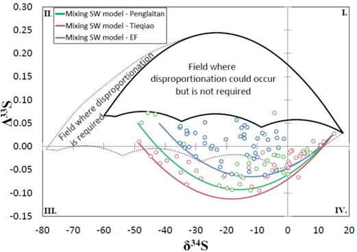 研究者们首先对中国广西来宾地区蓬莱滩“金钉子”剖面以及铁桥剖面样品中黄铁矿的多硫同位素组成进行了精确的测定,发现了负δ34S和负Δ33S以及正δ34S和负Δ33S结合的硫同位素组成(图1)。通过硫的生物地球化学循环以及硫同位素分馏原理的分析,他们认为异常的多硫同位素组成指示了海洋中硫的生物地球化学循环发生了很大的变化,而间歇性硫化海水的上涌是这一硫的生物地球化学循环体系转变的主导因素 。详细的化石资料表明,异常的多硫同位素组成与晚瓜德鲁普统生物大灭绝事件在时间上是一致的。因此,研究者们提出硫化海水上涌是导致晚瓜德鲁普统生物大灭绝的重要因素。