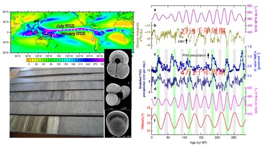 来自中国科学技术大学、台湾大学、中科院地球环境所和剑桥大学的研究团队利用位于西太平洋暖池的巴布亚新几内亚东缘,近岸1660米的深海底所获得的海洋沉积物岩芯的地球化学记录,重建了二十八万年以来西太平洋低纬度降雨带的迁移历史,发现其变化受到地球围绕太阳的轨道周期所控制,同时受到欧亚大陆的西伯利亚高压所影响。研究团队进一步发现,东亚-澳大利亚的季风系统,两者虽然为相依的气候带,却有着不对称的轨道周期性。其中北半球东亚地区降雨带的移动呈现两万三千年(岁差)周期的变化,而南半球澳大利亚则呈现显著的四万一千年(倾角)周期的律动。此研究以“Obliquity pacing of the western Paci?c Intertropical Convergence Zone over the past 282,000 years”为题于11月25日发表在《Nature Communications》上,11月27日入选《Science》杂志Science Editors' Choice (Vol 350, Issue 6264, p 1053),以“A shifting wet girdle around the tropics”为题作了特别报道,认为本工作对研究当今全球暖化下的热带降雨带的变迁有重要意义。