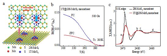 二维超薄半导体纳米片具有宏观上的超薄性、透明性、柔韧性和微观上优异的电学、磁学和光学性能,是实现自旋电子器件微型化和功能最大化、制备大面积和高质量的纳米自旋电子器件等领域极具发展潜力的材料。在众多二维超薄半导体纳米片中,MoS2纳米片具有类似于石墨烯的高载流子迁移率、可调的载流子类型以及高开/关比等优异的电学性质而引起了人们极大的研究兴趣,但它们的本征非铁磁性限制了它们在自旋电子器件中的实际应用,因此如何赋予MoS2二维超薄半导体纳米室温铁磁性,成为一个具有学术和应用研究两方面重要价值的科学问题。该研究组基于常温下具有三角棱柱配位环境(2H相)的MoS2中Mo原子磁矩为零,而八面体配位(1T相)的MoS2中Mo原子具有非零磁矩的物理事实,提出可以通过在2H相的MoS2 中通过“相掺杂”引入1T相MoS2来诱导室温铁磁性的设想(图a)。实验上,他们通过“两步合成法”,在2H相的MoS2 纳米片中引入硫空位,它能将周围呈八面体配位的Mo原子转变为三角棱柱的配位,从而实现将1T相的MoS2掺杂到2H相的MoS2 纳米片中。通过这一相掺杂方式,改变了Mo离子中3d电子轨道的占据特征,实现了MoS2超薄纳米片的室温铁磁性,居里温度为395 K(图b),饱和磁化强度为0.25 mB /Mo。软X射线吸收谱学和第一性原理计算 (图c)表明1T相中的Mo离子在费米面附近引入的间隙态是导致MoS2半导体纳米薄片具有高居里温度的根本原因。审稿人认为,“寻找室温磁性材料一直是一个亟需解决并面临重大挑战的问题。毫无疑问,这个研究在该方向取得了显著进展,获得了非常有趣的研究结果”。