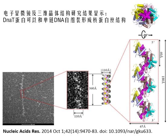 该研究在国际上首次报道了大肠杆菌DNA损伤修复过程中重要组件引发体蛋白DanT与单链DNA复合物的晶体结构,发现了一种全新的三螺旋束与单链DNA的结合模式,阐明了DanT与单链DNA之间的相互识别分子机制。该研究结果对于揭示大肠杆菌引发体PriA-PriB-ssDNA-DnaT复合物组装程序及DnaT蛋白在该过程中发挥的具体作用具有重大意义。