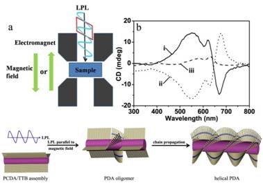 中科院软物质化学重点实验室、中国科大化学与材料科学学院高分子系邹纲副教授课题组近期在螺旋共轭聚合物的可控合成与应用领域取得重要进展。研究人员首次通过磁场和线偏振光辐照成功的实现了螺旋聚二乙炔组装体的可控合成。该工作近期以题为“Enantioselective synthesis of helical polydiacetylene by application of linearly polarized light and magnetic field”在线发表在Nature Communications上。(论文链接地址:http://www.nature.com/ncomms/2014/140923/ncomms6050/full/ncomms6050.html)