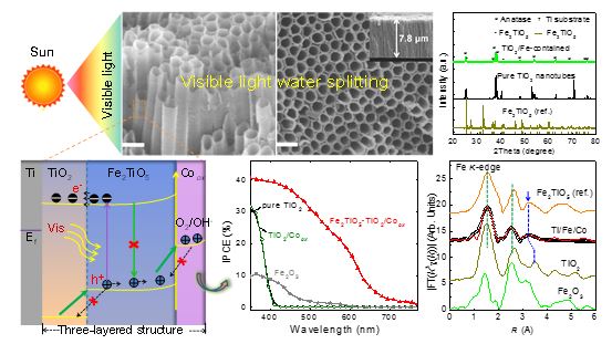 针对以上科学难点问题,他们从理论上提出一种通过形成“矢量迁移通道”的能级结构来引导光生载流子迁移的途径。实验上,通过将一层2~3 nm厚的Fe2TiO5窄禁带(2.2 eV)半导体材料包覆在高度有序的TiO2纳米管阵列表面,在Fe2TiO5/TiO2之间形成载流子分离界面,成功地将光生空穴从材料内部定向迁移到表面催化反应活性位点;同时,Fe2TiO5与TiO2匹配的导带结构极大减小了水分解反应的过电势,从而使得Fe2TiO5-TiO2复合结构在400-600nm波长范围的量子转换效率高达40%以上,总的能量转换效率达到2.7%。并利用同步辐射X射线吸收谱学和电化学阻抗谱技术等一系列测量和理论分析,证实了Fe2TiO5-TiO2界面的“矢量迁移通道”能级结构是实现光生载流子定向迁移的原因。审稿人认为“这项工作所提出的载流子分离方法和通过能级剪裁来降低水分解起始电势的途径在太阳能水分解领域有着非常重要的潜在意义”。