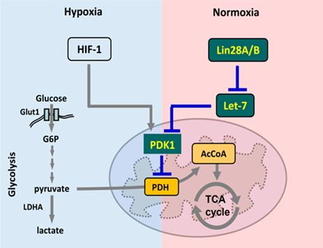 作为肿瘤特征之一的有氧糖酵解(Aerobic Glycolysis)或瓦伯格效应 (Warburg Effect),由著名科学家奥托·瓦博格于19世纪20年代提出。该效应提出肿瘤细胞无论在低氧和氧气充足的环境中,都倾向于通过一种低效的利用葡萄糖产生乳酸的糖酵解方式供给能量从而促进增殖。鉴于细胞代谢是一切生命活动的重要基础,许多年来,这种肿瘤特异的代谢方式引起了科学家们广泛的关注。前期的研究发现,在低氧条件下,低氧诱导因子HIF-1转录调控代谢酶PDK1抑制三羧酸循环,部分解释了肿瘤细胞中糖酵解增强的机制。但这并不能解释为什么肿瘤细胞在氧气充足的条件下倾向于利用低效的糖酵解方式这一现象。研究人员以此为切入点展开研究,发现在常氧条件下肿瘤细胞通过异常表达的Lin28/let-7调节轴转录后调控代谢酶PDK1,对肿瘤代谢进行重编程,从而促进糖酵解的发生。结果表明,这条非依赖于HIF-1的肿瘤代谢调控通路影响了肿瘤细胞的体外增殖和肿瘤的体内进展。因此,本文的发现对临床肿瘤的研究有着潜在的重要意义。