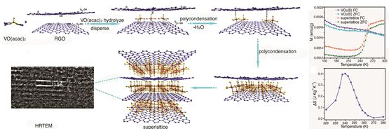 针对上述挑战,谢毅教授课题组首先提出了一种新的空间限域生长策略制备石墨烯基超晶格材料的方法,获得了完美堆垛的单层石墨烯-单层氧化钒-单层石墨烯……的超晶格结构,克服了传统生长超晶格材料的缺点。在这种石墨烯基超晶格材料中,石墨烯不仅可以作为一个独特的空间限域反应器使钒氧层沿着石墨烯面二维生长,而且可以作为电子给体,引起钒氧层结构的结构重组,降低生成高对称性钒氧骨架的生成能。他们与国家同步辐射实验室韦世强教授课题组合作,利用同步辐射X-射线吸收精细结构谱对该超晶格的精细结构进行了详细表征。结果表明,超晶格中的钒氧层的对称性明显大于在自由空间得到的VO2(B),并导致了一级可逆相转变的出现及由之产生的磁热效应,这种相转变类似于VO2(M)-VO2(R)相变过程中对称性由高到低的转变。由于超晶格中二维的单畴结构和石墨烯层的应力作用,这个转变过程中的磁熵变值相比于VO2(M)-VO2(R)相变的磁熵变值提高了8倍。重要的是,这种柔性的超晶格纳米片材料是用低成本的溶液法制得,避免了传统超晶格材料制备中复杂的转移过程,因此适应于各种功能器件的组装,有望加速超晶格材料的实际应用。