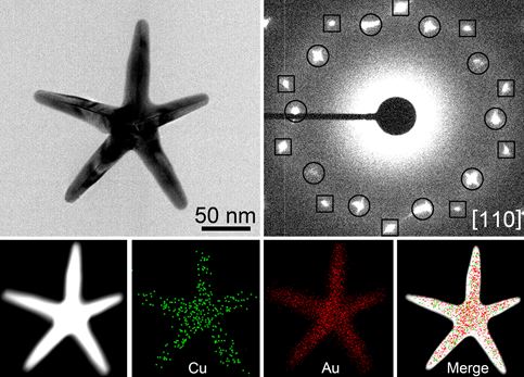 “一闪一闪亮晶晶,满天都是小星星......”,这首家喻户晓的儿歌激发了我校合肥微尺度物质科学国家实验室(筹)及化学与材料科学学院的曾杰教授课题组的研究灵感,研究人员进而发明了一种星形纳米材料,其集双宠于一身,兼具优良的光学性质和催化性能。该工作以“Facile synthesis of pentacle gold–copper alloy nanocrystals and their plasmonic and catalytic properties”为题发表在近日出版的《自然?通讯》上(Nature Commun. 5:4327 DOI: 10.1038/ncomms5327)。