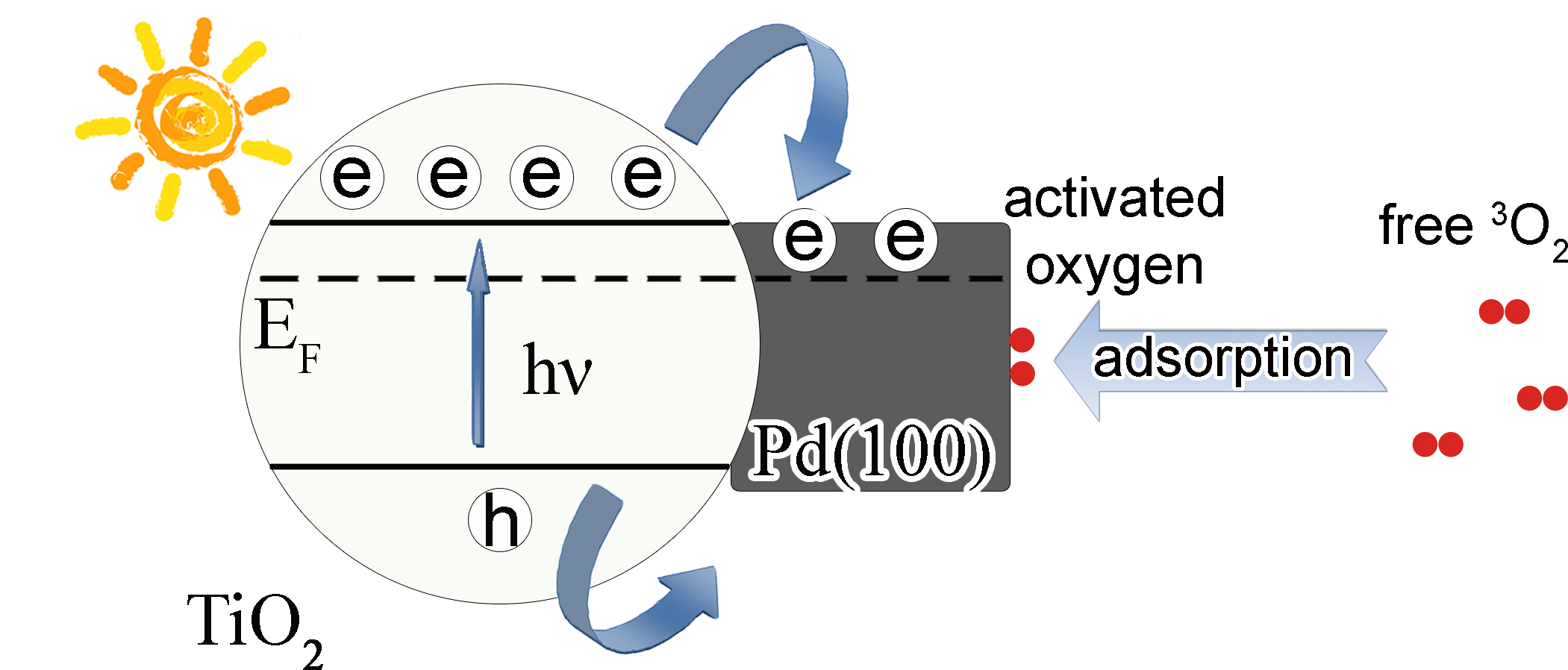 氧分子在二氧化钛-钯复合体系中的活化行为示意图