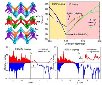 杨金龙教授研究组基于LaMnAsO和LaZnAsO两种已经存在的物质,设计了一种新的层状合金材料La(Mn0.5Zn0.5)AsO。这是一种与传统“1111”型铁基超导体同构的反铁磁半导体材料。通过在该材料的[LaO]+层进行电子掺杂(H-/F-替换O2-)、或者空穴掺杂(Ca2+/Sr2+替换La3+),可以诱导该材料从反铁磁半导体转变成铁磁半金属。理论预测新材料的居里温度可达 600 K(50% 浓度H掺杂)与475 K(25% 浓度Ca掺杂),半金属能隙可达0.74eV。同时,该体系的准二维结构赋予材料极高的磁各向异性能,其理论预测值比目前已获得的半金属材料高一至两个数量级。