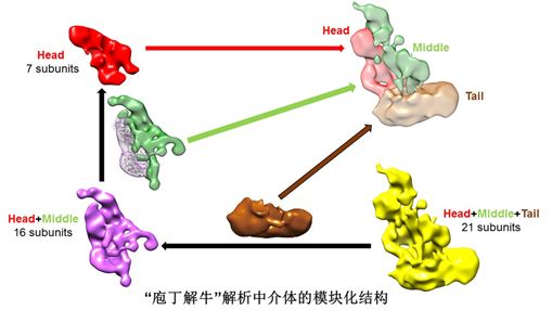 中介体(Mediator complex)在转录中扮演关键角色,被称为“转录中央控制器”。它是由几十个不同蛋白质组成的庞大的分子机器,由头部、中部、尾部3个稳定模块构成;其模块化结构和亚基组成从低等的酵母到高等哺乳动物高度保守。冷冻电镜(cryo-EM)是当前能够解析完整中介体三维结构的唯一方法;但受限于结构上的复杂性,已报道的电镜结构分辨率很低,无法定位各个模块,甚至头部模块的晶体结构对接到中介体电镜结构的位置都不确定。原先对于中介体的模块化结构认识模糊,且与大量结构和功能实验数据相抵触,大大限制了对中介体精细结构和作用分子机制的认识。