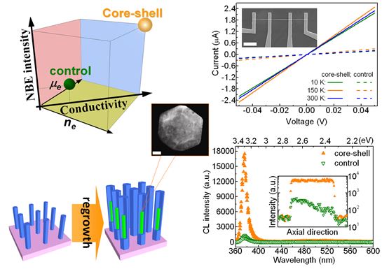 ZnO纳米线有着完美的光学纳腔结构和室温下丰富的多量子态耦合作用,不仅是凝聚态物理和量子光学领域的重要研究对象,也是纳米尺度紫外光子学和光电器件的候选材料之一。要实现纳米尺度的优质紫外光源,必须使ZnO纳米线同时拥有高效的带边发光和优良的电学性质,但现有的体掺杂方式难以同时满足上述要求。这是因为优良的电学性质要求材料通过掺杂提供浓度足够高的自由载流子,而过多的掺杂必将导致带边辐射复合效率的显著下降。