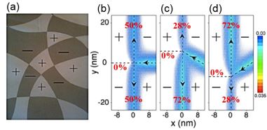 图 1:(a) 不同拓扑态组成的网络示意图,正/负用来表示各区域相反的外加电场或者相反的拓扑量子数;(b) 当右入射电流与下导线成90o,60o,120o入射角度时的电流的实空间分布示意图。上,下和左导线上的三个百分数表示出射在这三个导线上的电流的相对强度。