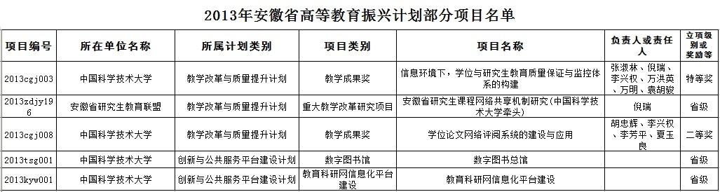 日前,省教育厅、省财政厅公布了《2013年安徽省高等教育振兴计划部分项目名单》,我校多个信息化建设项目获批。其中,张淑林副校长主持的“信息化环境下,学位与研究生教育质量保证与监控体系的构建”项目获安徽省教学成果特等奖;由我校牵头的安徽省研究生教育联盟项目“安徽省研究生课程网络共享机制研究”获重大教学改革研究项目支持;“学位论文网络评阅系统的建设与应用”项目获安徽省教学成果二等奖。另外,我校图书馆作为“安徽省数字图书总馆”,网络信息中心作为“安徽省教育科研网中心”,获创新与公共服务平台建设计划支持,合计经费1550万元。