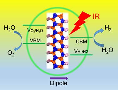 利用太阳光分解水制氢,为人类提供清洁燃料,被视为化学的圣杯。水分解是吸热反应,传统理论要求光催化剂的能隙至少要大于反应吸热(1.23eV),因而占太阳光能量近一半的红外光无法被吸收用来分解水制氢。杨金龙教授研究组提出具有內禀电偶极矩的二维纳米催化剂,可突破传统理论对催化剂能隙的限制,用红外光也可以分解水产生氢气。这种催化剂存在偶极内电场,吸附在催化剂两个表面上的水分子会感受到不同的静电势,从而导致两个表面上水的氧化还原电势变得不再相同。如果氧化和还原分别发生在不同的表面,催化剂受到的能隙限制原则上将不再存在。在这一新的光解水机制中,不仅紫外光和可见光,红外光也可以用来促使水分解产生氢气。另外,这种催化剂的光激发是一个电荷转移过程,电子和空穴分别产生在两个不同的表面,催化剂固有偶极电场有效促进了光生电子空穴对的空间分离,并做功帮助水分解产生氢气。基于这一机制,他们设计了一种双层氮化硼纳米体系,其两个表面分别用氢和氟修饰。理论计算与模拟表明这是一种有效的红外光催化分解水体系。