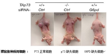 相对于p73正常的细胞(左图),p73缺失细胞(中图)在裸鼠中的的成瘤能力明显变小,如果G6PD被敲低(右图),细胞的成瘤能力也会变小。p73通过G6PD促进肿瘤生长。