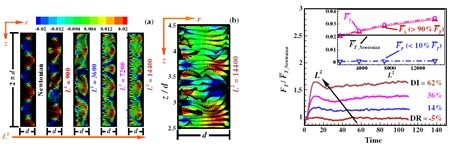 刘难生副教授与合作者的研究表明,大分子添加剂在曲壁湍流中可引起超过60%的阻力剧增,这与此前一直备受关注的在平直壁面(槽道或圆管)湍流中大分子诱导的高达70%的减阻效果截然相反。分析指出,大分子拉伸与流体剪切之间存在高度的非线性相互作用,导致流场中大尺度Taylor涡结构破碎成为两种形成机理完全不同的小尺度涡结构,即惯性失稳产生的Taylor涡和弹性失稳触发的G?tler涡,从而引发了湍流阻力的急剧增大;G?tler涡结构产生的具体根源在于,大分子添加剂在静止外圆柱附近诱导了局部弹性失稳,并进一步触发了更强的G?tler失稳。