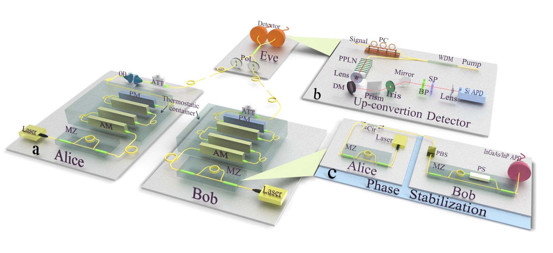 潘建伟小组发展了独立激光光源的干涉技术,并与美国斯坦福大学联合开发了国际上迄今为止最先进的室温通信波段单光子探测器——基于周期极化铌酸锂波导的上转换探测器,在此基础上,结合清华大学马雄峰教授的理论分析,在世界上首次实现了测量设备无关的安全量子密钥分发,该实验先天免疫于任何针对探测系统的攻击,完美地解决了探测系统的安全隐患问题。另外,该实验系统兼顾采用诱骗态方案,同时保证了非理想光源系统的安全性。