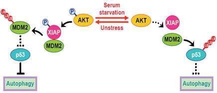 XIAP (X-linked inhibitor of apoptosis protein, X连锁凋亡抑制蛋白)作为凋亡抑制蛋白 (Inhibitor of Apoptosis Proteins, IAPs)家族的一个重要成员,其表达水平在人类许多类型的肿瘤中显著上调。一直以来,人们认为XIAP是通过行使其抗凋亡的功能来促进肿瘤形成的。然而,XIAP缺失的小鼠发育正常,并没有呈现出明显的细胞凋亡的表型,这暗示XIAP可能不是通过抑制细胞凋亡来促进肿瘤形成的。那么XIAP的高表达究竟是如何促进肿瘤形成的?吴缅教授领导的研究组在该项新研究中发现XIAP通过抑制细胞自噬进而促进肿瘤的生长。该研究组通过实验证实,磷酸化的XIAP能发挥泛素连接酶的功能,通过直接结合Mdm2,介导Mdm2的快速降解,最终导致细胞质中p53蛋白水平的升高,以此来抑制细胞自噬。通过小鼠肿瘤模型,该研究证实了XIAP可以通过抑制细胞自噬,从而加速肿瘤的生长;更为重要的是,该研究也证实了XIAP高表达引起的细胞自噬被抑制的现象确实存在于多种肿瘤临床标本中。这一研究结果揭示了XIAP作为原癌蛋白促进肿瘤形成的一个全新的分子机制,并为以XIAP作为靶点进行抗肿瘤药物的开发提供了更为精确的理论基础。