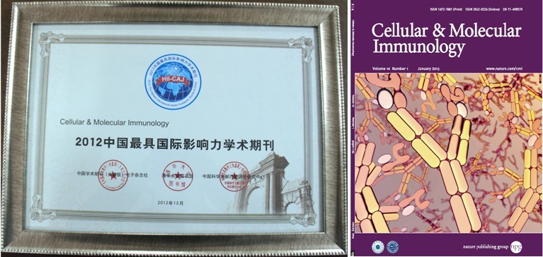 《Cellular & Molecular Immunology》期刊创刊于2004年,是我国唯一的免疫学SCI源期刊,也是我国最年轻、发展最快的免疫学期刊,经过九年的沉淀与发展,现在基本实现稿源国际化、审稿国际化、出版数字化,成为亚太地区较具影响免疫学期刊之一。先后有27国家和地区的500多位作者的投稿,这些文章被51个国家和地区的近2000位学者所引用。所刊载的文章多次被 J New Engl Med,Science,Nat Immunol,Nat Rev Imuunol,Immnity等国际顶级刊物所引用,2011年影响因子为2.992,高于全球免疫学类所有期刊的平均影响因子,根据测算该刊2012年影响因子约为3.5,较上一年度增长16.7%;目前在我国主办的医学类SCI期刊排名第1位,中国154种SCI期刊中排名第7位。