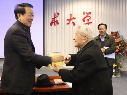 日前,中国化学会决定授予我校教授、著名有机化学家、化学教育家刘有成院士“物理有机化学终身成就奖”。1月5日,中国化学会物理有机化学专业委员会负责人佟振合院士、程津培院士、吴云东院士专程来合肥为刘有成院士颁奖。