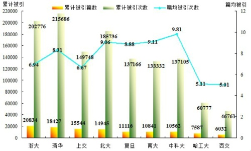 此外,我校SCI论文的持续影响力保持提升态势。最近10年(2002-2011年)我校累计发表SCI论文13982篇,累计被引用10562篇,占论文总数的3/4;累计被引用137105次,平均每篇论文被引用9.81次,较上一统计年度的8.45次提升了16%;篇均被引次数继续保持C9高校第一。