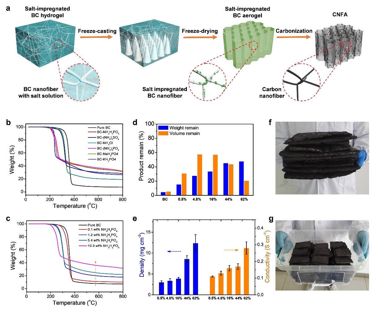 图1、宏观尺寸CNFAs的合成。(a)CNFAs制造工艺示意图;(b)纯BC和BC浸渍NH4H2PO4、(NH4)2SO4、NH4Cl、(NH4)3PO4、NaH2PO4或KH2PO4的TG曲线;(c)纯BC和BC浸渍不同浓度NH4H2PO4后的TG曲线;(d)以纯BC和BC为原料,在800°C下加入不同量的NH4H2PO4炭化制备CNFAs(NH4H2PO4的重量比分别为0.5、4.8、16、44和62 wt%);(e)1200 ℃下制备的CNFAs的密度和导电性;(f ~g)在800℃下制备的CNFAs照片,展示了其可以大规模制备。