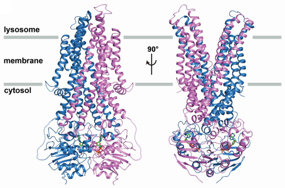 维生素B12仅能在自然界少数细菌和古细菌中合成,而其作为一种人类必需的营养物质,只能从食物中摄取。维生素B12通过受体介导的内吞作用进入细胞,随后以游离形态储存于溶酶体中,需要时外排至细胞质而被利用。研究表明人类ATP结合盒式(ABC)转运蛋白 ABCD4定位于溶酶体膜上,可能在溶酶体内维生素B12外排至细胞质过程中起到关键作用。ABCD4基因的突变可能导致一系列先天性维生素B12缺陷病。其症状表现为肌张力减退、骨髓抑制、巨红细胞性贫血和心脏病等。然而溶酶体内维生素B12外排的分子机制却不清楚,制约了对相关疾病的深入了解和治疗。