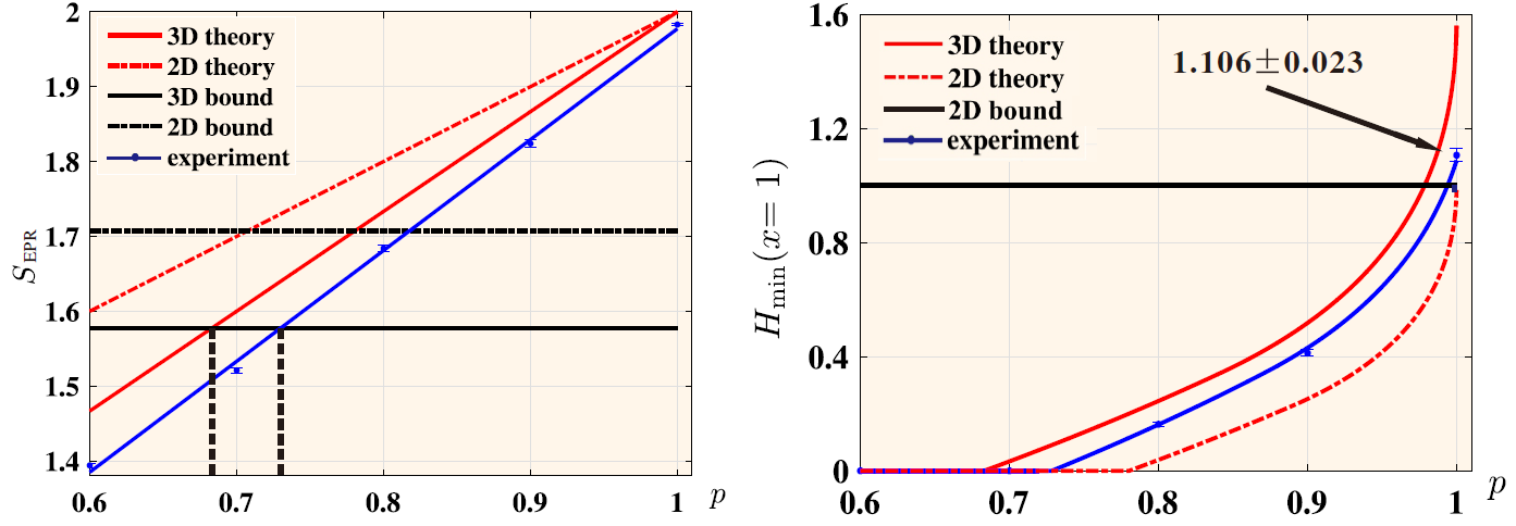 受此启发,李传锋、柳必恒等人巧妙构地造出测量设备无关的高维量子导引目击算符,首次实验实现了测量设备无关的高维量子导引。研究组利用参量下转换过程在偏振和路径自由度上制备出一系列高保真度三维纠缠态。然后仲裁者向纠缠双方发出一系列测试要求,收集双方数据检验高维量子导引不等式,测试结果最高达到1.983(0.002),远超过三维情形的经典理论极限1.57,证实这些纠缠态具有量子导引特性。作为应用,研究组进一步将实验观测到的数据运用于随机数产生,每纠缠光子对可得到1.106(0.023)比特私密量子随机数,超出了利用两维纠缠态所能达到的理论极限(1比特每纠缠光子对),充分展示了高维纠缠在量子信息过程中的优势。