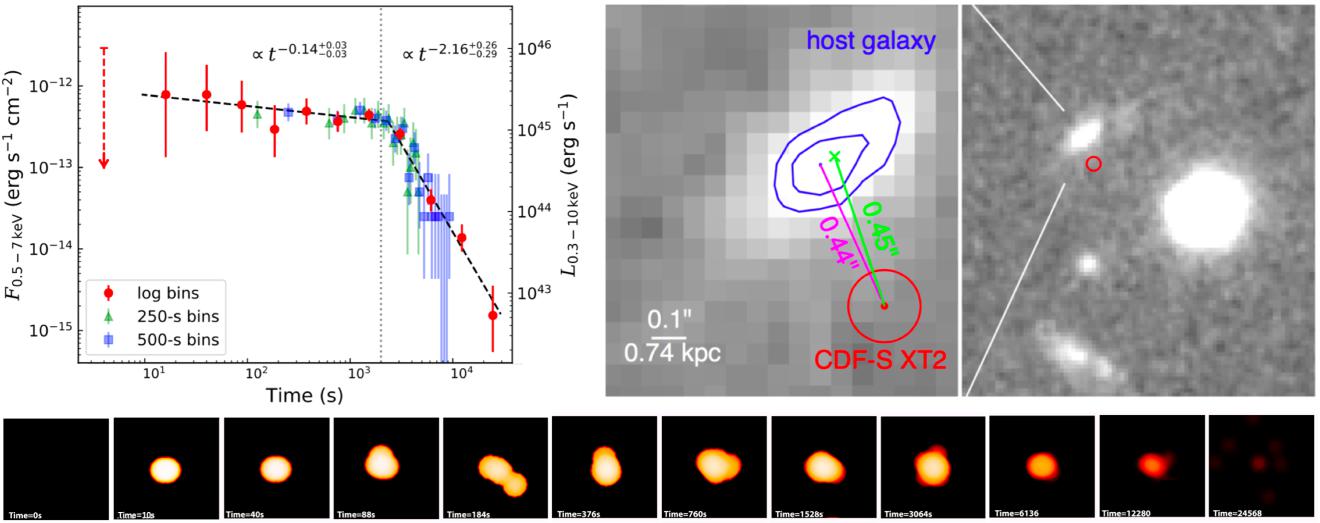 薛永泉教授等人在迄今为止最深、最灵敏的X射线巡天——七百万秒钱德拉南天深场(7Ms CDF-S)里发现了一个新型的X射线暂现源(称为CDF-S XT2,简称XT2;其X射线辐射仅持续了约7个小时),其红移为0.738,即距离我们约66亿光年远。观测数据与理论分析显示:(1)XT2没有伽玛射线探测。(2)XT2的光变曲线具有从平台期(即光度基本不变)到下降期(光度随时间t成-2次方幂律衰减)快速演化的特征形状与时标(见图2左上及图2下),与理论预言的大质量毫秒磁星产生的X射线辐射完美吻合。(3)XT2位于其寄主星系的外沿(见图2右上),这和双中子星受超新星爆炸不对称的反冲力作用被“踢出”至星系边缘的图像吻合;而且基于XT2寄主星系各项物理属性算出的XT2起源于双致密星并合的概率非常得高。(4)估算的类似XT2的暂现源事件发生率被修正到位于近邻宇宙里的值时,其与由第一例双中子星并合引力波事件GW170817可靠导出的双中子星并合发生率相符,从而进一步支持了XT2的双中子星并合起源。以上论据一致表明,XT2是首例双中子星并合形成的磁星所驱动的X射线暂现源,且其没有对应的短伽玛射线暴。