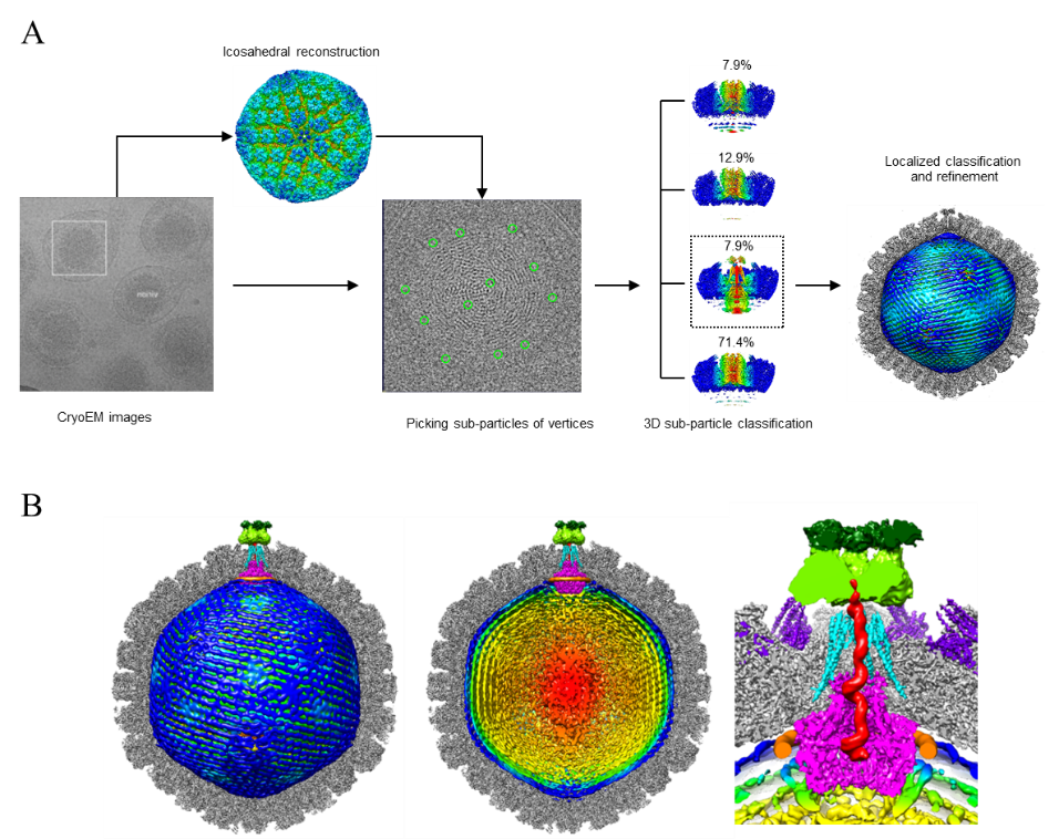 图2.基于连续局部分类和对称性释放的高分辨冷冻电镜三维重构方法(上图);完整人类单纯疱疹病毒(HSV-1)的DNA通道蛋白和DNA基因组高分辨三维结构(下图)