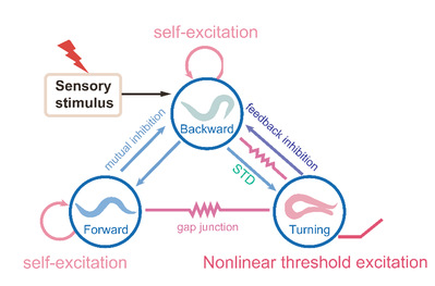 线虫在受到外界潜在危险和威胁时,例如机械刺激或者热刺激,会稳健地触发逃逸行为。这种逃逸行为具有保守的组成模块(前进运动,后退运动,转弯运动),但是每个运动模块的出现序列和延续时间却大不相同。综合光遗传技术、钙成像技术、和计算建模,研究组发现:模块之间的兴奋性前馈通路可以解释为何外界刺激能稳健地触发某种运动序列;而不同运动模块之间又通过相互抑制实行赢家通吃(Winner-take-all),从而实现不同运动方式之间的灵活转移。短时程突触可塑性以及神经系统的内禀噪声也在调控运动时序过程中扮演重要角色。借助线虫的神经网络联结图谱和分子生物学技术,研究组进一步鉴定出前馈的神经通路依赖于中间神经元和运动神经元之间的电突触;模块之间的相互抑制则依赖上游神经元释放谷氨酸能神经递质和下游神经元表达相应的氯离子通道。