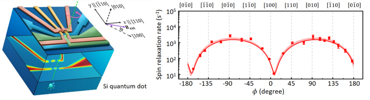 图 1.硅基半导体自旋量子比特芯片装置示意图和自旋弛豫速率的强各向异性。